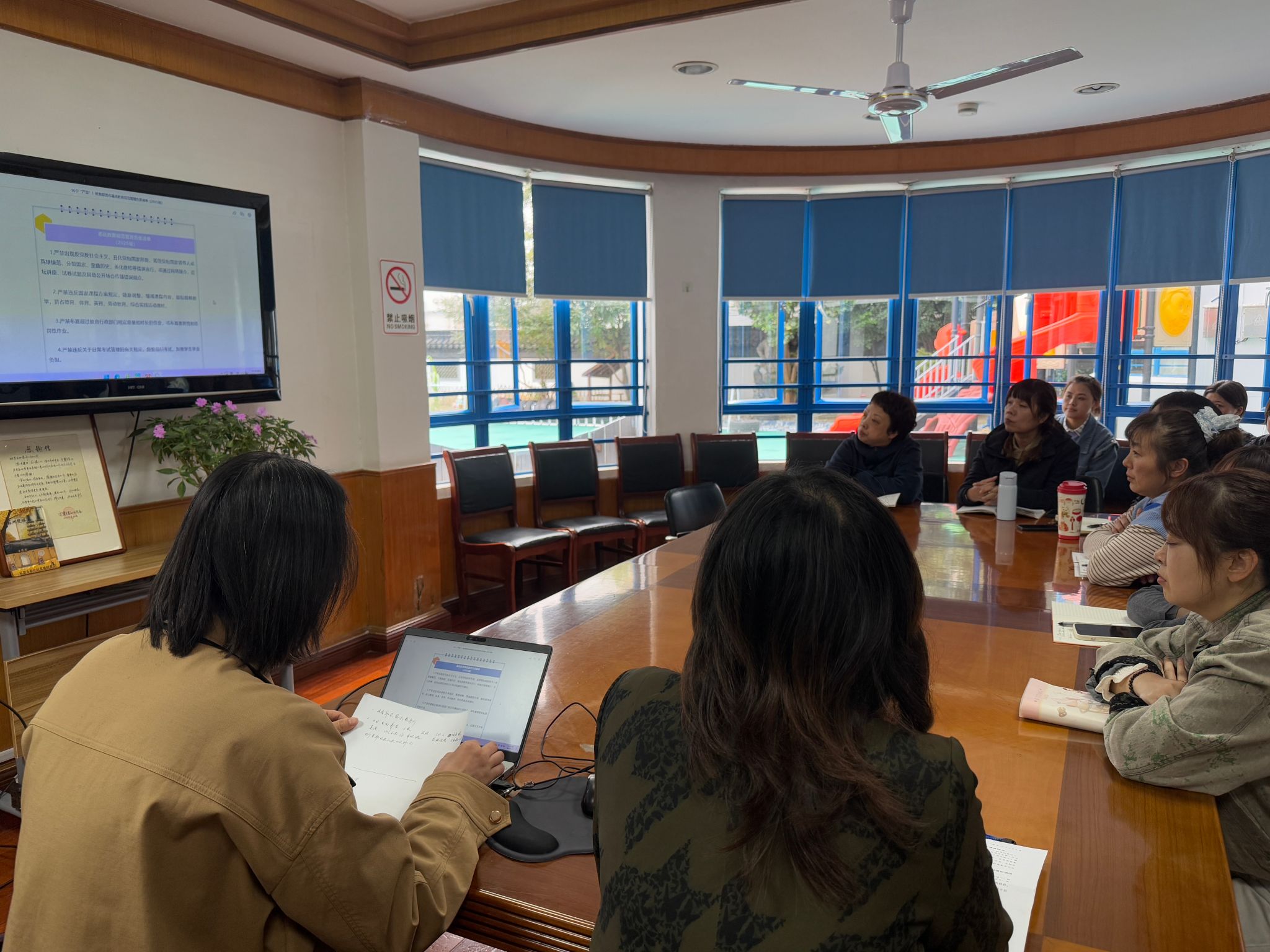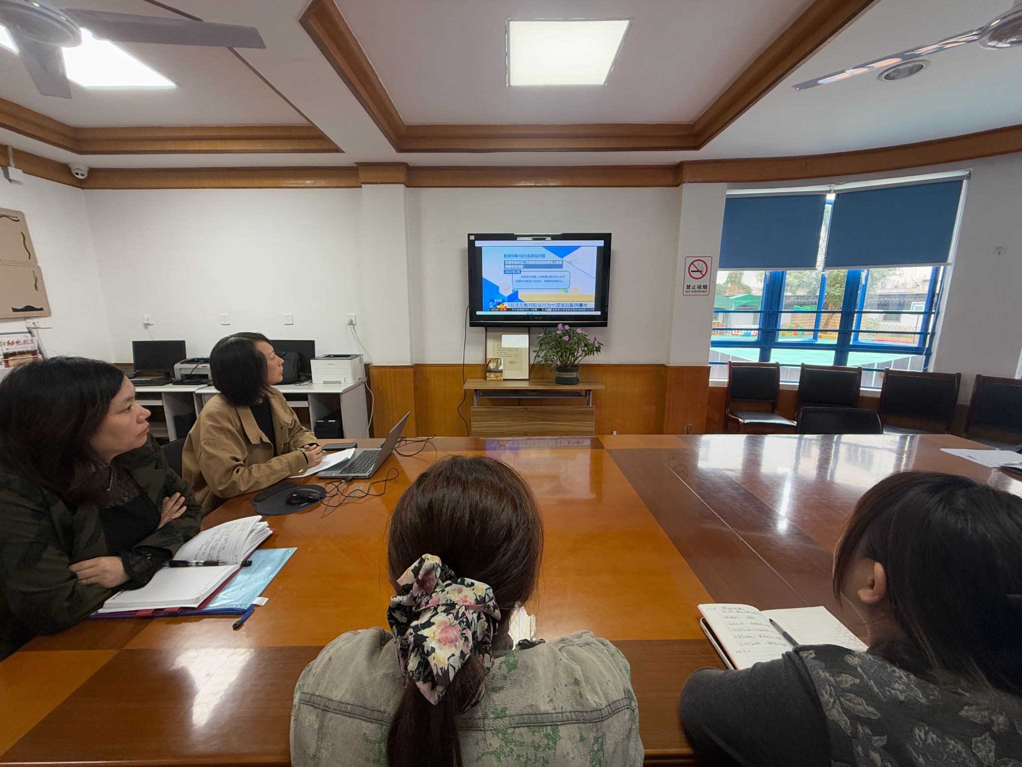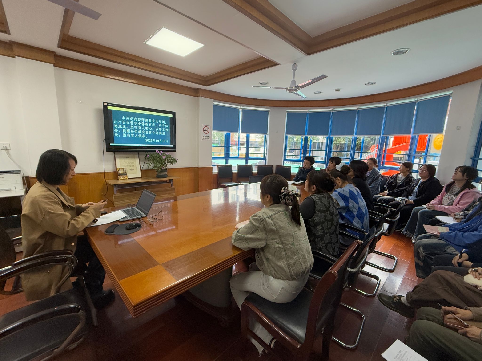 活 动 记 录 | 一、主持人:幼儿阶段是孩子安全感建立、性格萌芽的关键时期,幼儿园教师作为孩子离开家庭后的“第一任集体引路人”,一言一行都可能成为孩子模仿的范本,师德师风直接关系到幼儿身心健康成长的底色。为筑牢全园教师的职业底线,强化“以幼为本”的教育理念,本次活动通过观看幼儿相关警示案例、学习基础教育规范清单,引导大家从反面案例中吸取教训,明确日常工作中的“不可为”,切实以专业、温暖的态度呵护幼儿成长,守护家长的托付与信任。 二、观看“8起违反教师职业行为十项准则典型案例”警示教育片 1.天津市咸水沽二中教师肖某某在课堂上歧视、侮辱学生问题。