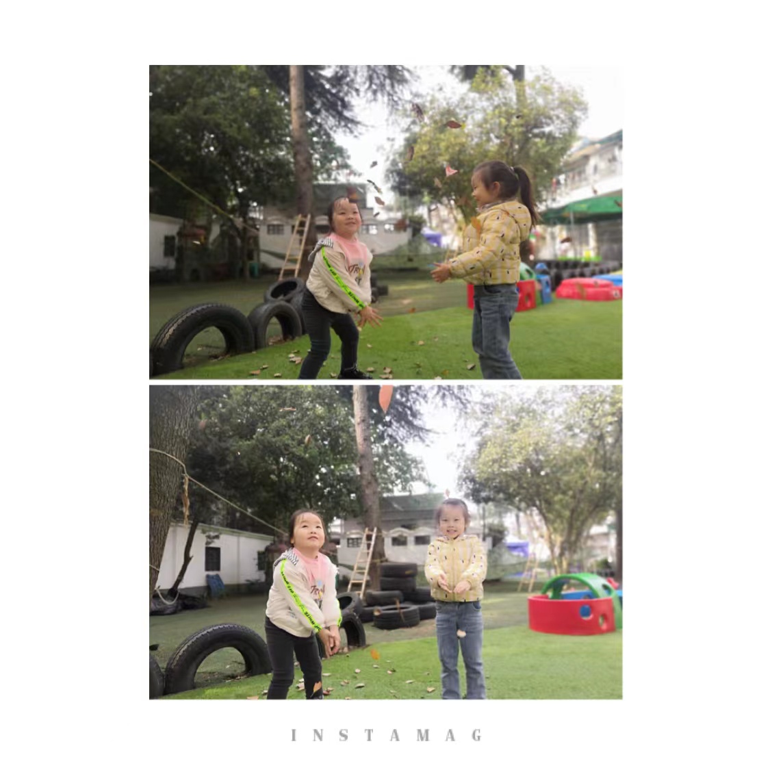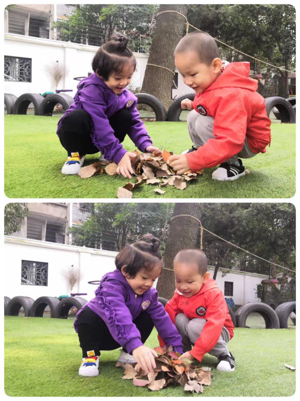 捧起一大把落叶,抛向天空。哇~哇,快看,下叶子雨了。落叶像蝴蝶在跳舞。