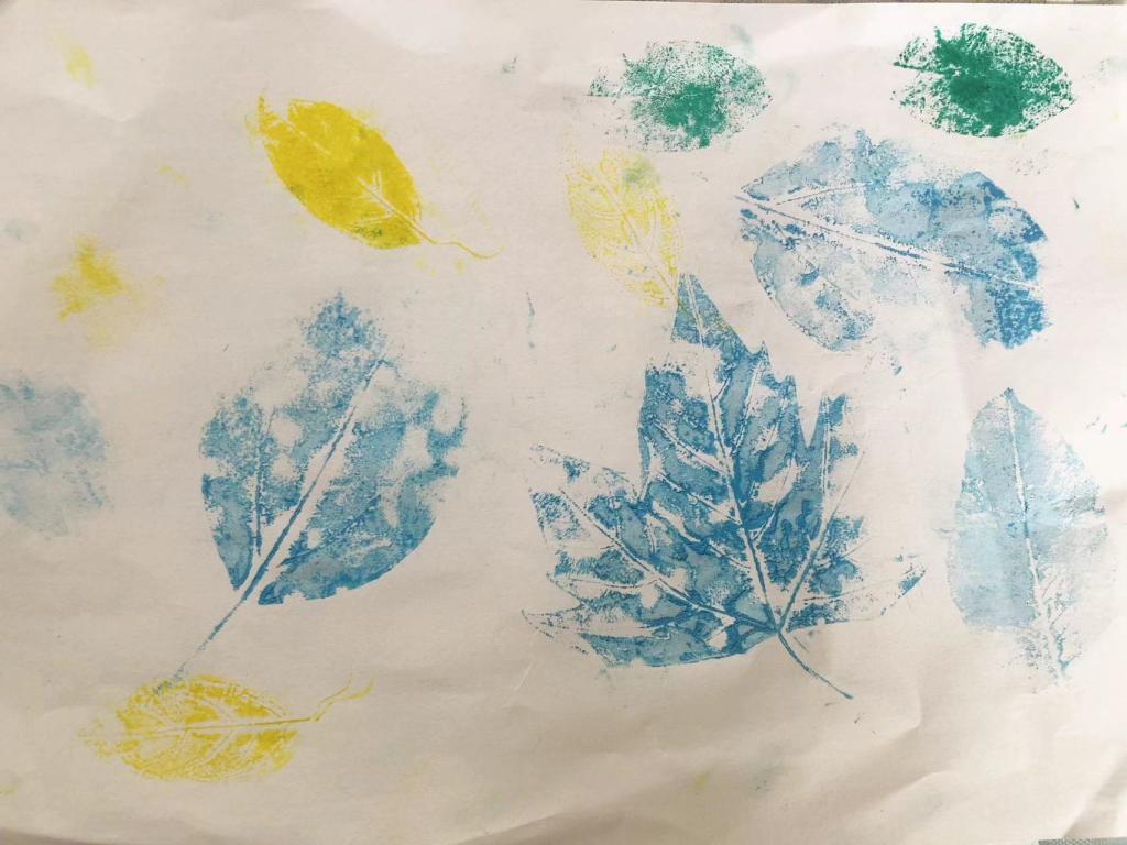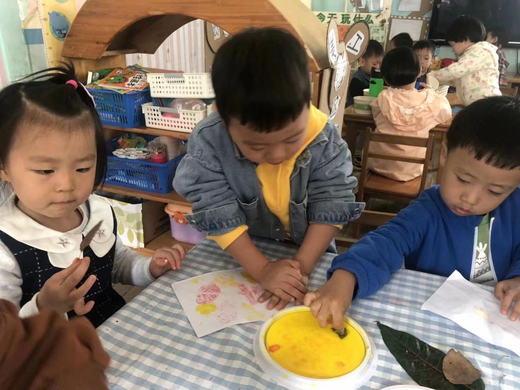 幼儿:我们还可以做树叶拓印画,在树叶上涂上漂亮的颜色,再反过来印一印就完成啦,她一定会喜欢的!