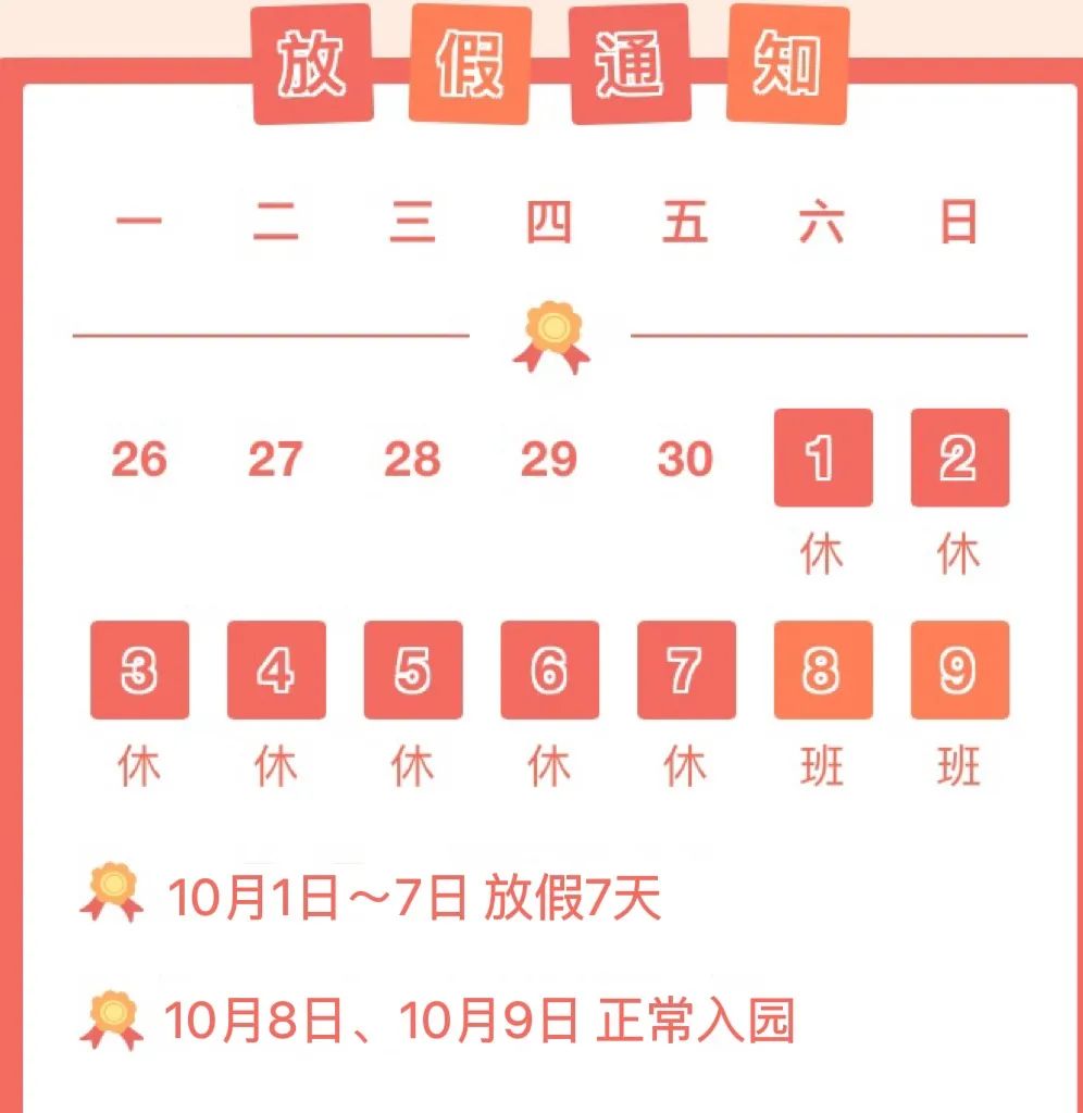 您好!怀着喜悦的心情,我们迎来了中华人民共和国成立73周年,为了让小朋友们度过一个愉快、安全的假期,现将国庆节放假时间和注意事项安排如下: