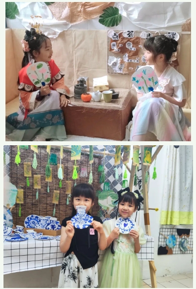 国潮市集摊位前,孩子们亲手制作的书画、纸扇、泥人、编织、扎染等传统手工艺品,让孩子们爱不释手。在市集里逛一逛,用兑换券兑换自己心仪的手工艺品,传递着温情和幸福!