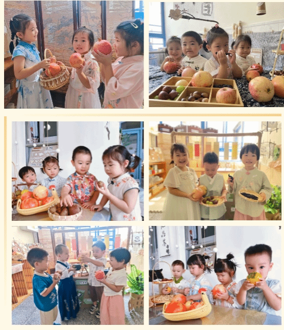 中秋节有很多特定传统美食,如:石榴、柿子、苹果、柚子、板栗、芋艿等。 孩子们通过摸摸、闻闻、看看,来认识和了解中秋节的传统食品,感受中秋节的饮食习俗。幼儿园还准备了香香甜甜的月饼,邀请宝贝们快来开启舌尖上的中秋之旅吧!