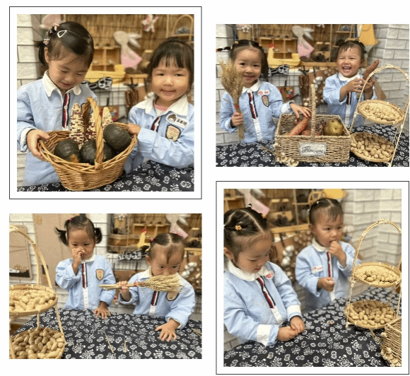 托班的孩子们通过看一看、摸一摸、闻一闻、尝一尝等方式,认识了各种农作物,增加了对粮食的了解。