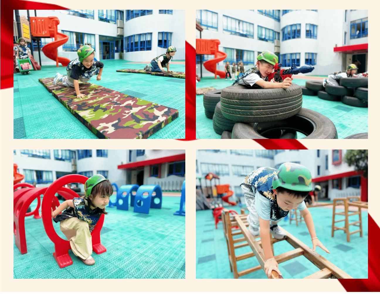 “飞夺泸定桥”“勇渡大渡河”“飞越大雪山”…… 小兵训练营里,一场场模拟红色征程的游戏热闹开展!孩子们化身小小兵,勇敢跨越攀爬梯、轮胎、梅花桩等障碍,每一次跨越都是勇气的见证,每一次挑战都彰显着保家卫国的决心。