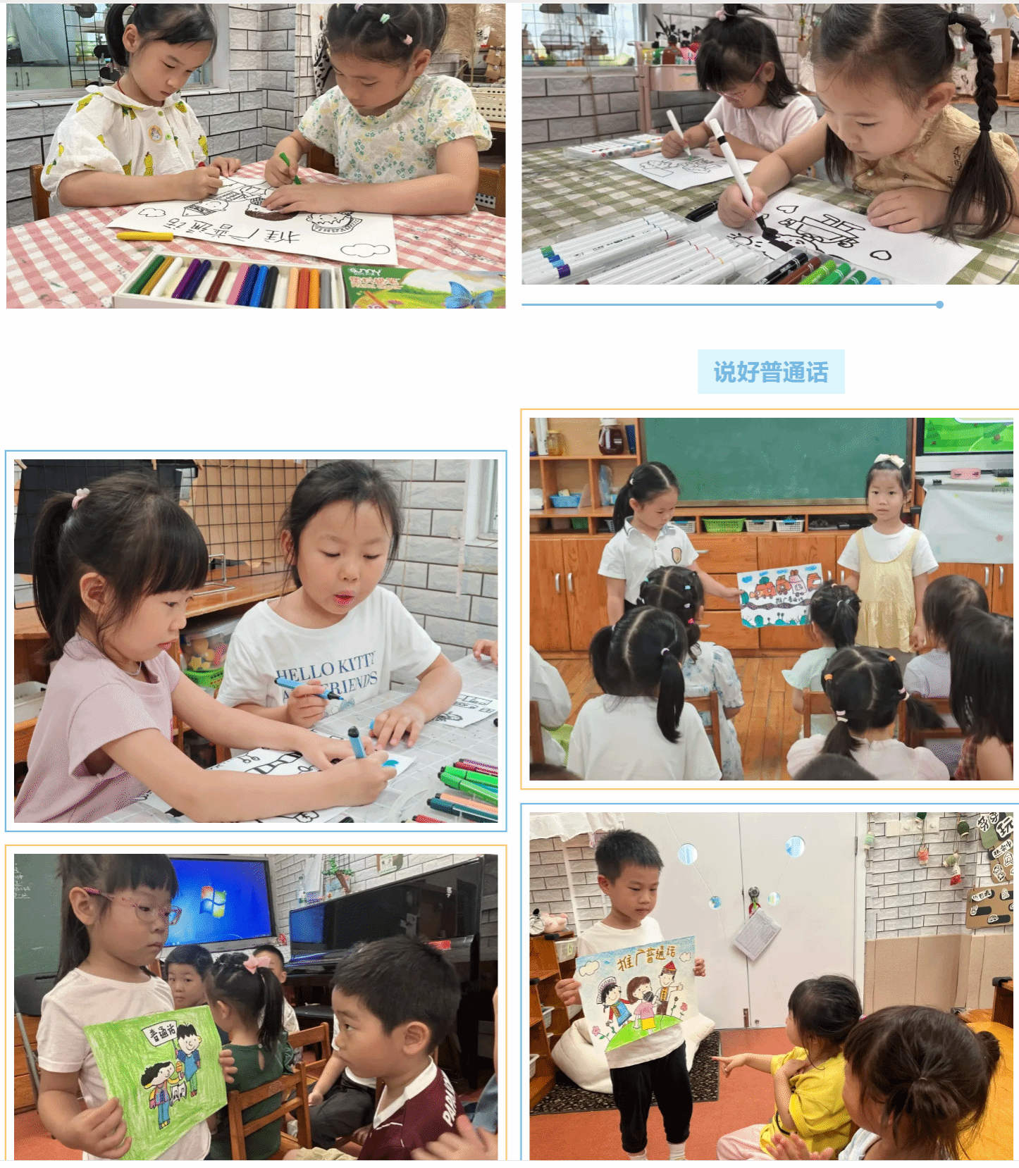 大班的孩子们化身“推普小卫士”,绘制了宣传海报。他们用五彩画笔勾勒“说好普通话”的倡议,用童趣图案传递规范用语的理念,以实际行动成为推普宣传的小小代言人。