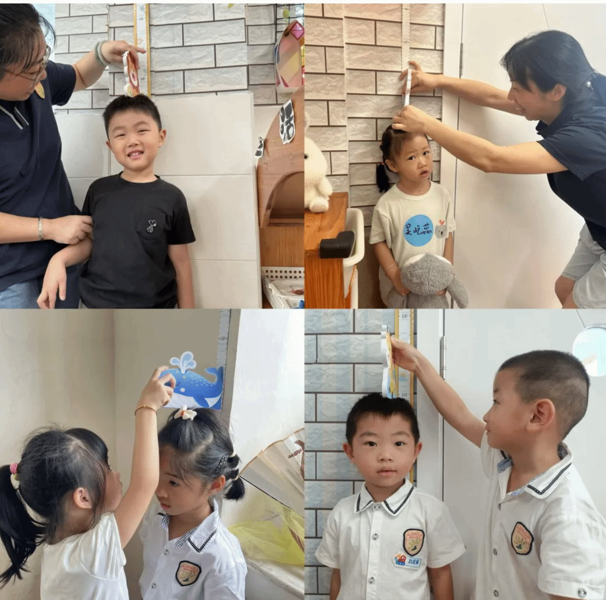 在老师和小伙伴的帮助下,“双幼娃”们一一测量了身高,并将测量结果记录下来放入成长册。等期末再来比一比,就能发现自己悄悄长大的惊喜啦!