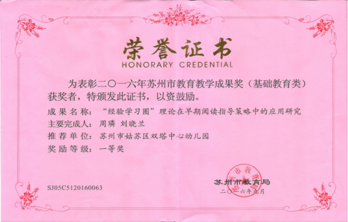 2016年苏州市教育教学成果奖荣誉证书
